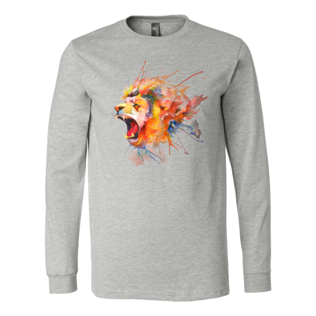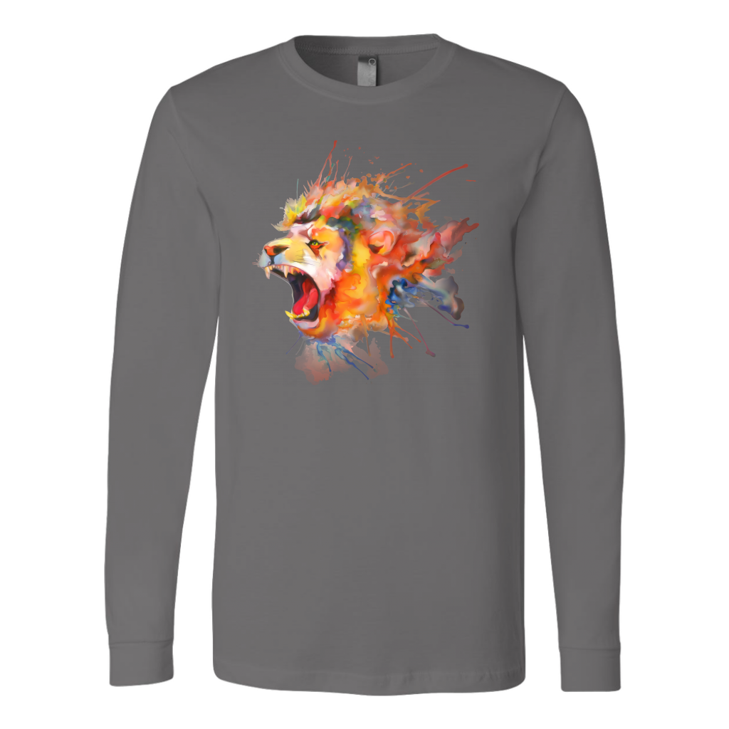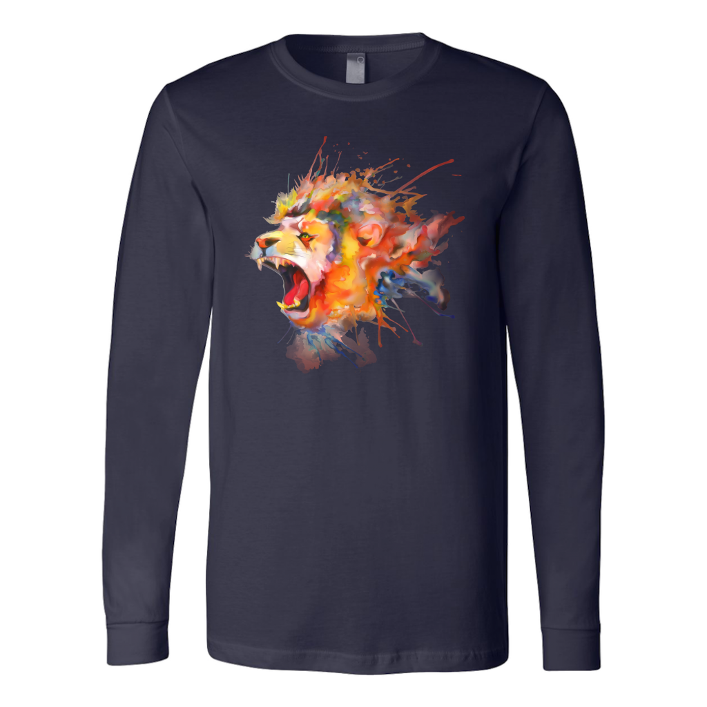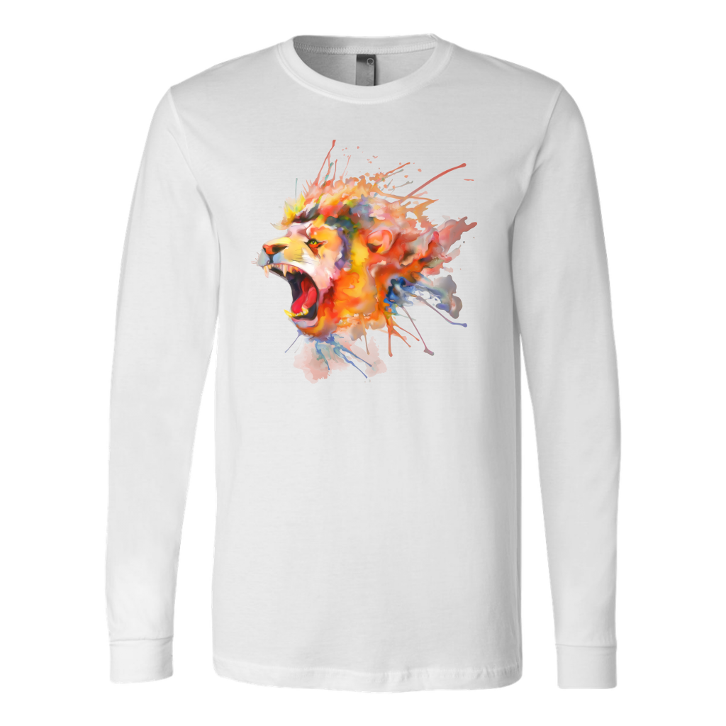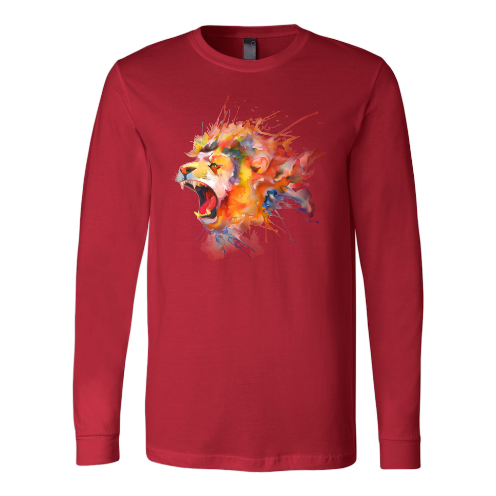 From the same artist that brought us the watercolor donut and chocolate comes now the Roaring Lion watercolor design on a Canvas Long Sleeve Shirt.
